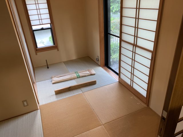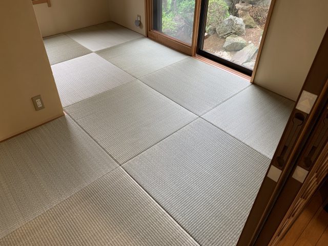 琉球表(七島イ)を使って既存の縁無し畳(目積表)の表替え工事をしました。素敵な琉球畳のお部屋になってお客様も大満足。香りも風合いも最高です。